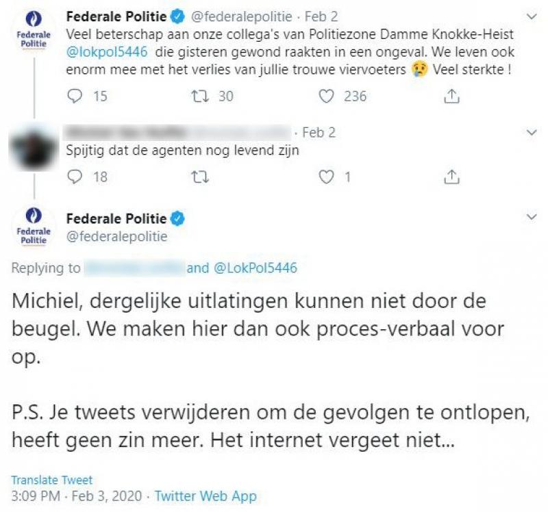Een man vond het nodig om daarop een smakeloos antwoord te tweeten. Spijtig dat de agenten nog levend zijn, schreef hij. De Federale Politie liet de tweet niet zomaar passeren en bestrafte hem meteen. Michiel, dergelijke uitlatingen kunnen niet door de beugel. We maken hier dan ook proces-verbaal voor op. P.S. Je tweets verwijderen om de gevolgen te ontlopen, heeft geen zin meer. Het internet vergeet niet..., antwoordden ze.