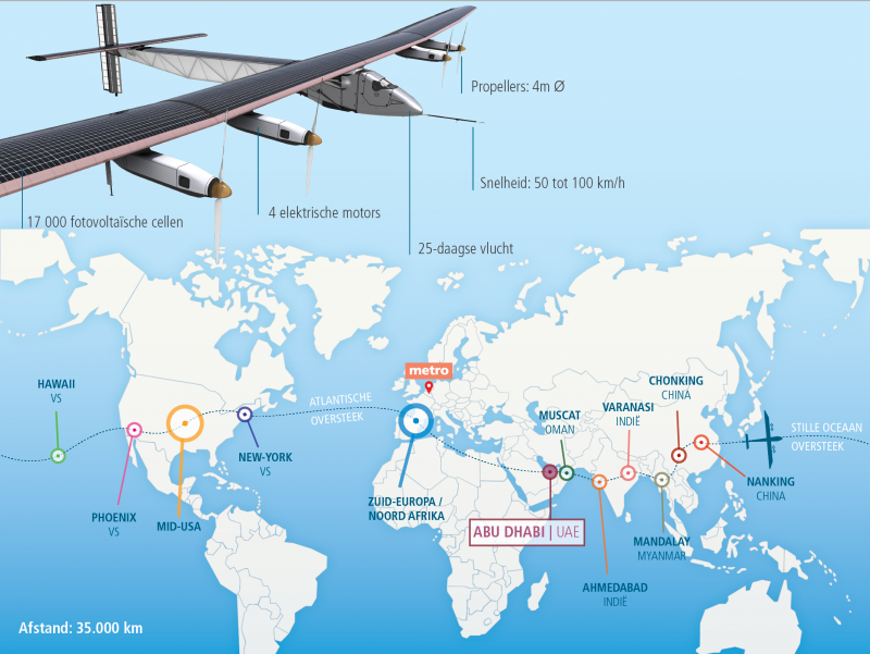 In totaal zal het vliegtuig wel maar 25 dagen in de lucht hangen. Er zijn 12 onderhoud - stops voorzien. Dan wordt er ook campagne gevoerd over schone energie. De eerste stop is Muscat, de hoofdstad van Oman.