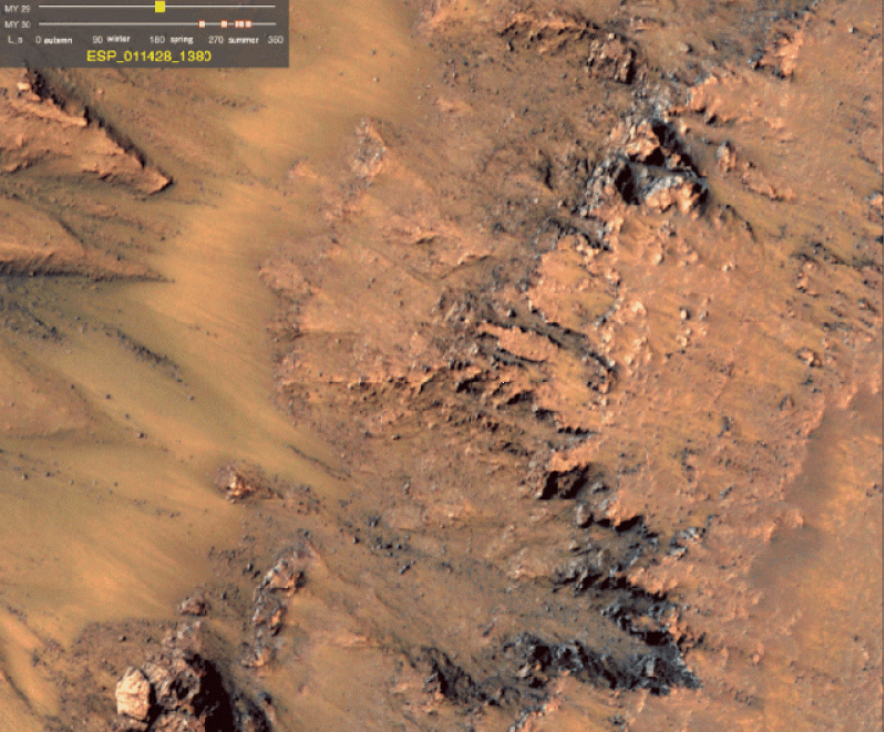 Op de afbeelding ziet u donkere strepen die naar beneden bewegen van een helling. De donkere lijnen zouden water kunnen zijn dat tijdens de warmere zomermaanden vloeibaar is. Maar hoe kan er vloeibaar water zijn op de planeet waar de temperaturen zelfs in de zomermaanden onder het vriespunt liggen? Wetenschappers denken dat het water een soort van natuurlijk antivries bevat. Die hypothese wordt gestaafd met het argument dat het water een verhoogd ijzergehalte zou hebben.