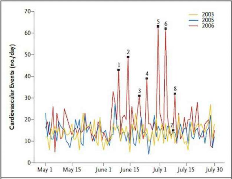 In 2008 verzamelde het team van artsen onder leiding van Ute Wilbert-Lampen rapporten van ziekenhuizen in de omgeving van München. Ze analyseerden het aantal opnames na een hartaanval of hartritmestoornissen tijdens het WK 2006 in Duitsland. Ze vergeleken het aantal hartaanvallen op de zeven dagen dat de Duitse nationale ploeg speelde met het aantal op de 24 dagen dat Duitsland niet moest spelen. Na controles van de omgevingsfactoren zoals temperatuur en luchtvervuiling, berekenden Wilbert-Lampen en zijn collega's dat de kans dat Duitsers tijdens een wedstrijd van hun nationaal elftal in het ziekenhuis belandden door een hartaanval of hartritmestoornissen, 2,66 keer groter was dan op andere dagen.
