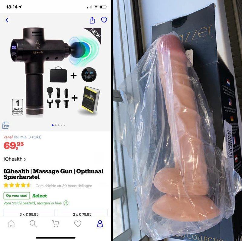 ?Danielle Cayden? bestelde zondag een massagetoestel op Bol.com. Haar man had immers al een week lang last van zijn rug en wilde daar zo snel mogelijk van af. Maandagmiddag werd het pakketje bij haar thuis geleverd, maar toen zij en haar man het openden, fronsten ze hun wenkbrauwen. In de doos zat geen massagetoestel, maar een gigantisch speeltje om andere lichaamsdelen mee te verwennen.