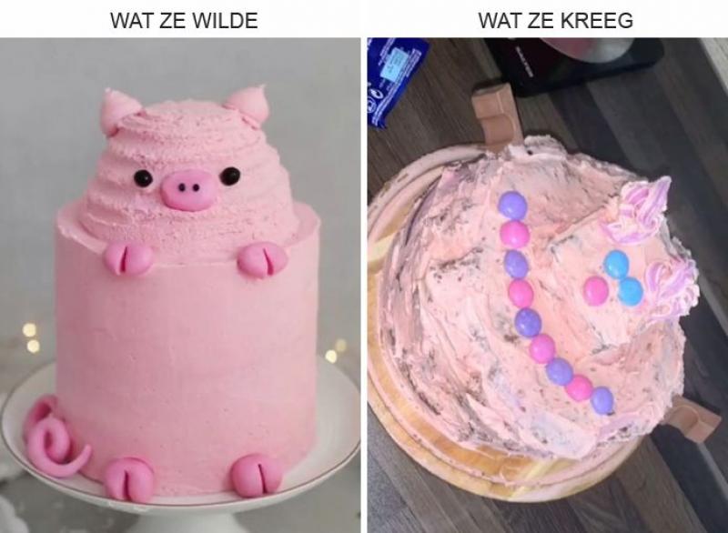 De teleurstelling was echter groot als ze de taart kreeg. Er was immers geen spoor te bekennen van een varkentje, noch van een krulstaart of een varkensneus. Het was gewoon een roze taart met smarties die een lachend gezicht vormen en chocoladerepen als armen.