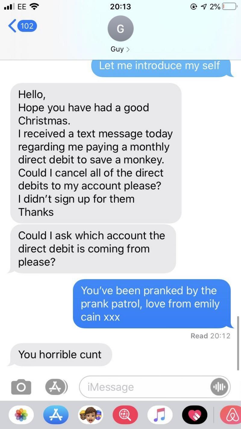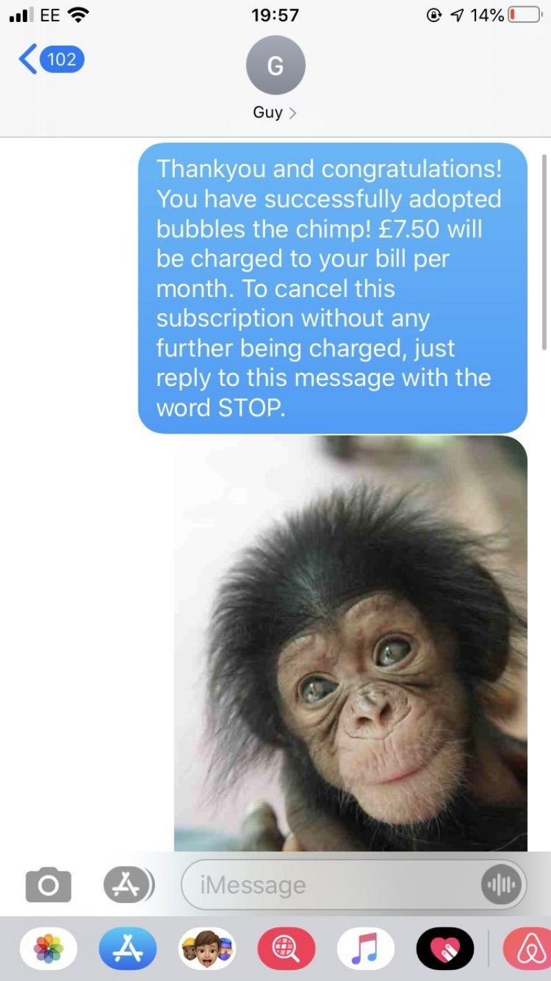 Emily Cain kreeg onlangs het nummer van een wildvreemde man die haar beter wilde leren kennen. De 18-jarige studente uit Newcastle upon Tyne besloot zijn opdringerigheid af te straffen door hem wijs te maken dat hij, door het meegeven van zijn nummer, een chimpansee had geadopteerd. Bedankt en proficiat, bij deze heb je Bubbles de chimpansee geadopteerd. Er zal elke maand 8,8 euro van je rekening gehaald worden. Om je abonnement op te zeggen, hoef je gewoon te reageren met het woord STOP', stuurde ze hem.