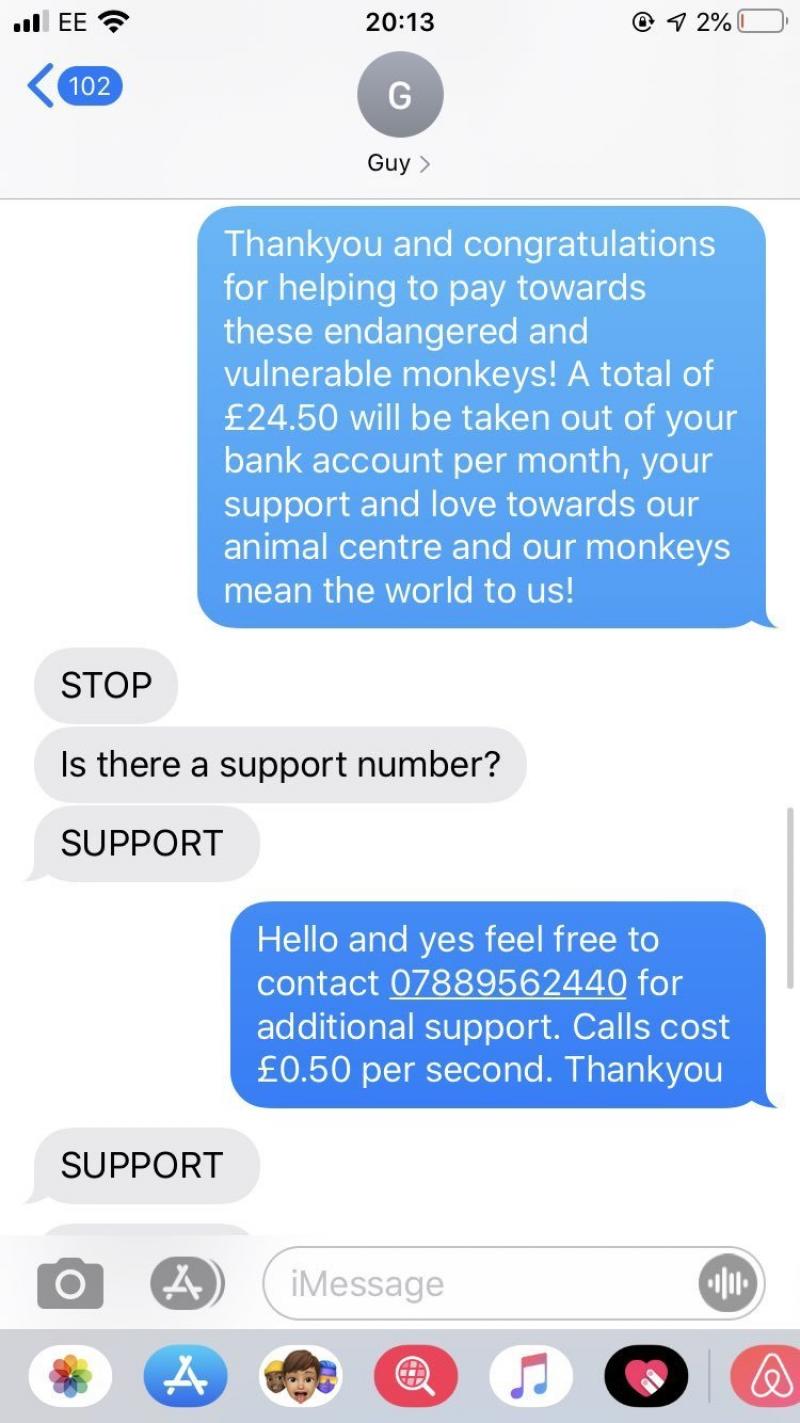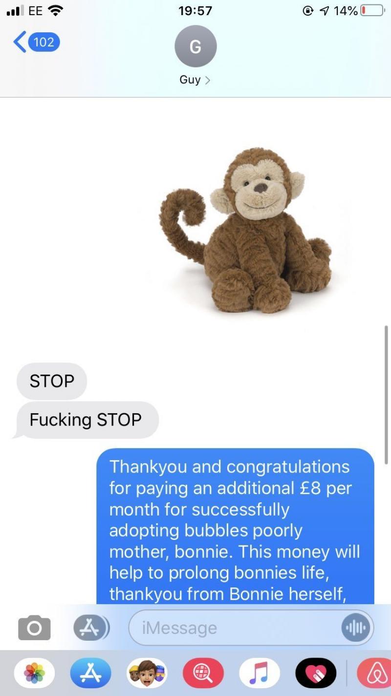 De man schrok zich een aap en stuurde STOP' op het bericht, maar Emily kende nog geen genade. Bedankt voor de 5,87 euro extra per maand om Bubbles te voorzien van eten en water. Om je abonnement op te zeggen, hoef je gewoon te reageren met het woord STOP', schreef ze.