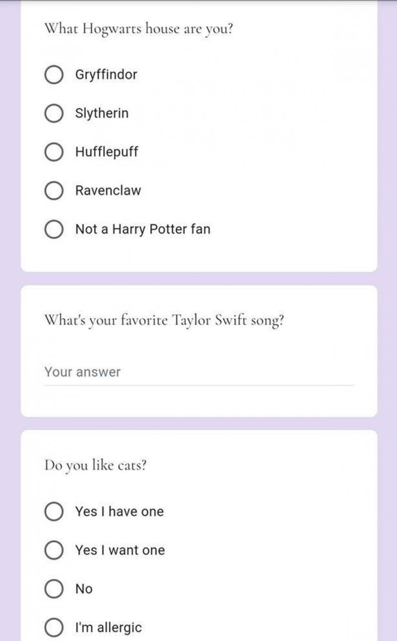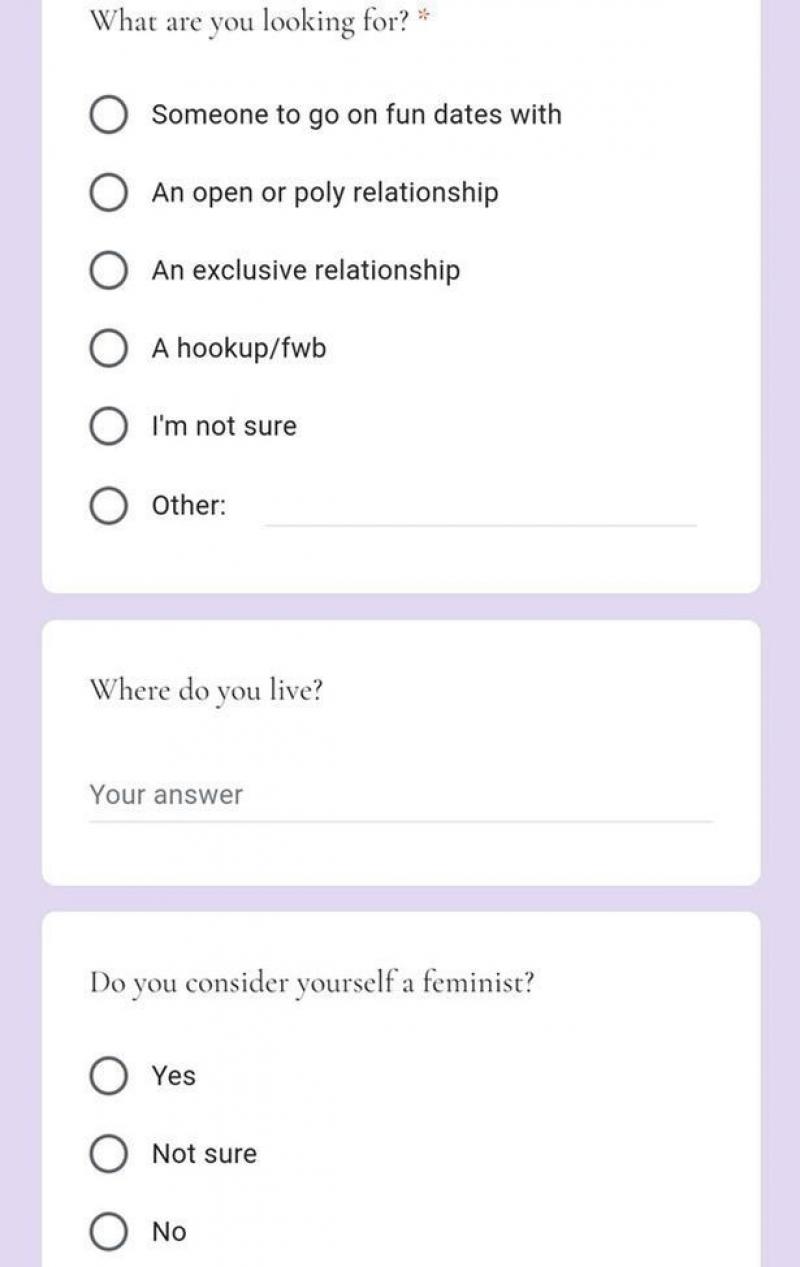 "Naar wat voor relatie ben je op zoek?", is de eerste vraag die de match na wat basisvragen zoals naam en leeftijd moest invullen. Nadien wordt het al iets gewaagder: "Ben je een feminist?" Maar ook populaire cultuur is van belang, getuige de vragen over Taylor Swift en Harry Potter. Nog een vraag luidt of je van katten houdt, of of je allergisch bent.