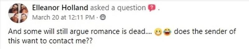 Haar partner, de 32-jarige Adam Greenway, voelt zich gelukkig niet bedreigd door de gedurfde poging om zijn vriendin te stelen. Haar enige verklaring voor de worstjes was dat ze misschien achtergelaten waren als traktatie voor haar hond Teddy. Ze plaatste een foto van het liefdespakket op een lokale Facebook-groep en schreef: "En sommigen zullen nog steeds beweren dat romantiek dood is. Wil de afzender hiervan contact met me opnemen?"