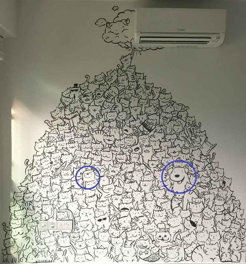 Omdat het Singaporese stel echte kattenliefhebbers zijn en thuis twee viervoeters hebben rondlopen, besloot Raphaela Ho de muur vol te tekenen met poezen. Maar tussen alle pluizige katten zitten ook twee honden verstopt. Kan jij ze vinden?