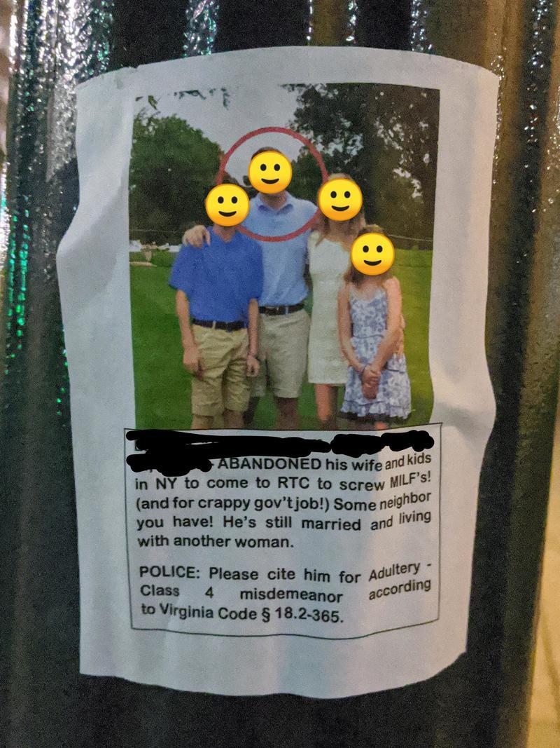 De poster werd gedeeld op Reddit door een buurtbewoner. Er staat een gezinsfoto op waarvan het hoofd van de man in het rood omcirkeld is. Deze man liet zijn vrouw en kinderen in de steek om te flikflooien met andere moeders (en voor een waardeloze overheidsjob). Wat een buurman! Hij is nog steeds getrouwd en woont nu bij een andere vrouw. Politie: markeer hem als overspelpleger, misdrijf van de vierde graad volgens de wet in Virginia, schreef de vrouw erbij.