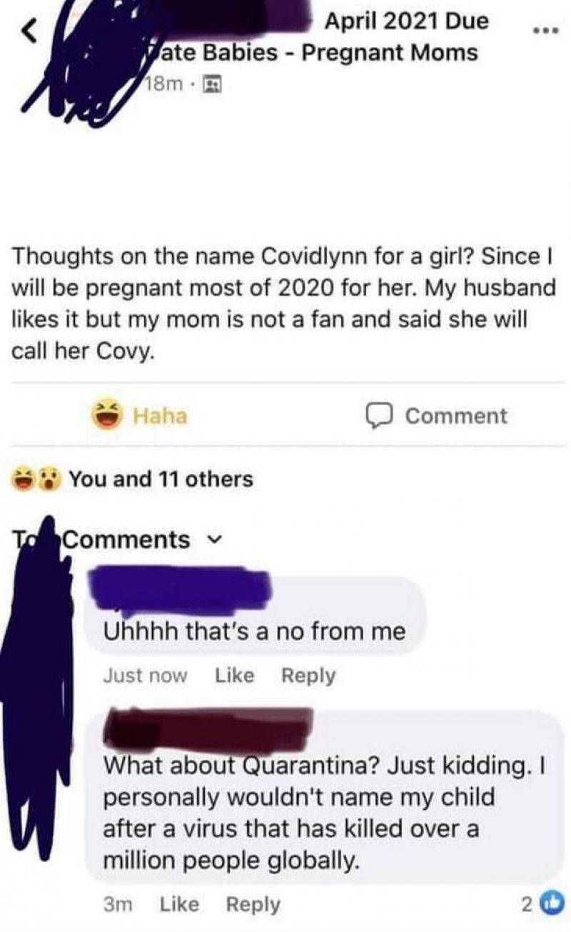 De vrouw is zwanger van een meisje dat uitgerekend is voor april 2021. Ze overweegt om haar dochter Covidlynn te noemen en vroeg in een Facebookgroep wat anderen ervan denken. Wat vinden jullie van Covidlynn voor een meisje? Ik zal immers een groot stuk van 2020 zwanger van haar zijn. Mijn echtgenoot vindt het een leuke naam, maar mijn moeder is er geen fan van en zegt dat ze haar Covy zal noemen, schrijft ze.