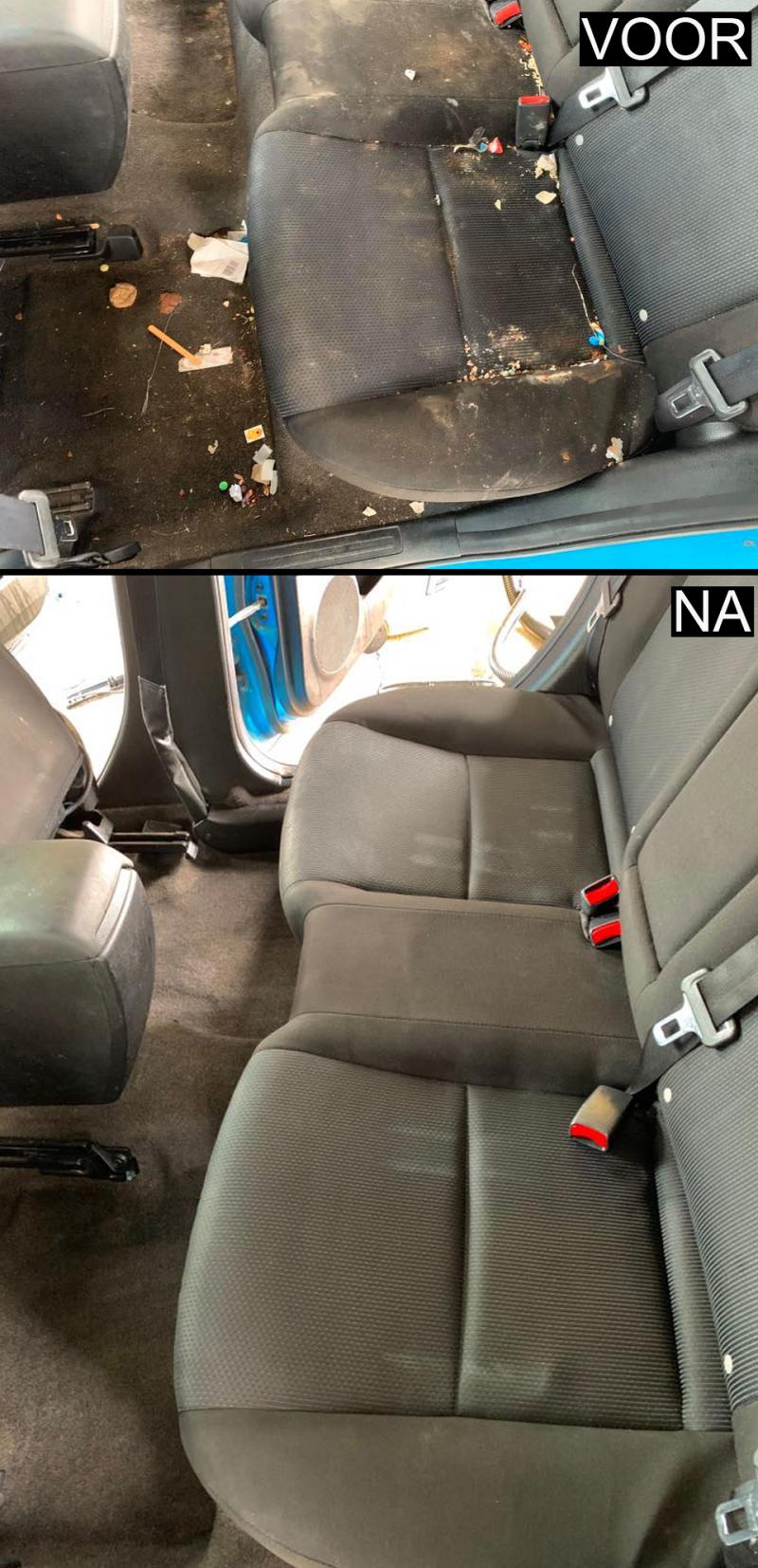 Sommige details waren niet meer te redden, zoals de restanten van babystoelen op de achterzetels. We raden klanten altijd aan om een handdoek onder babystoelen te leggen om dergelijke zetelschade te vermijden, waarschuwen ze.
