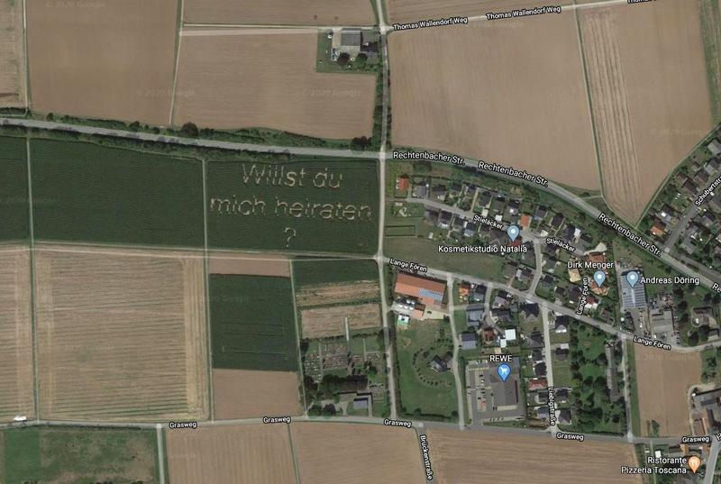 Het opvallende huwelijksaanzoek is nog steeds te bewonderen met Google Maps. Via DEZE LINK kan je het gedetailleerd bekijken.