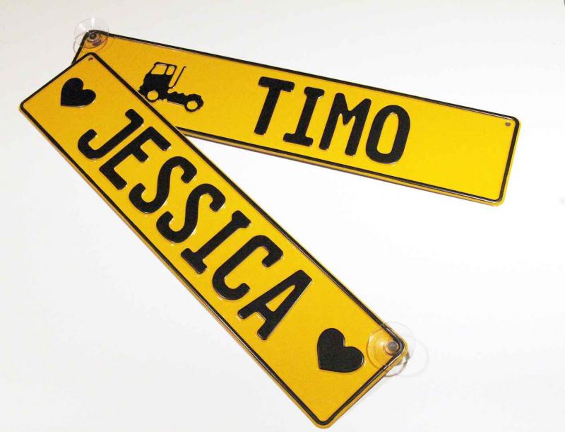 Nummerplaten Jessica & Timo - Hij is sinds twee jaar samen met zijn grote liefde Jessica. Voor haar is hij van internationale chauffeur naar Benelux-chauffeur gewisseld. Hij zet de nummerplaten trots achter zijn voorruit.