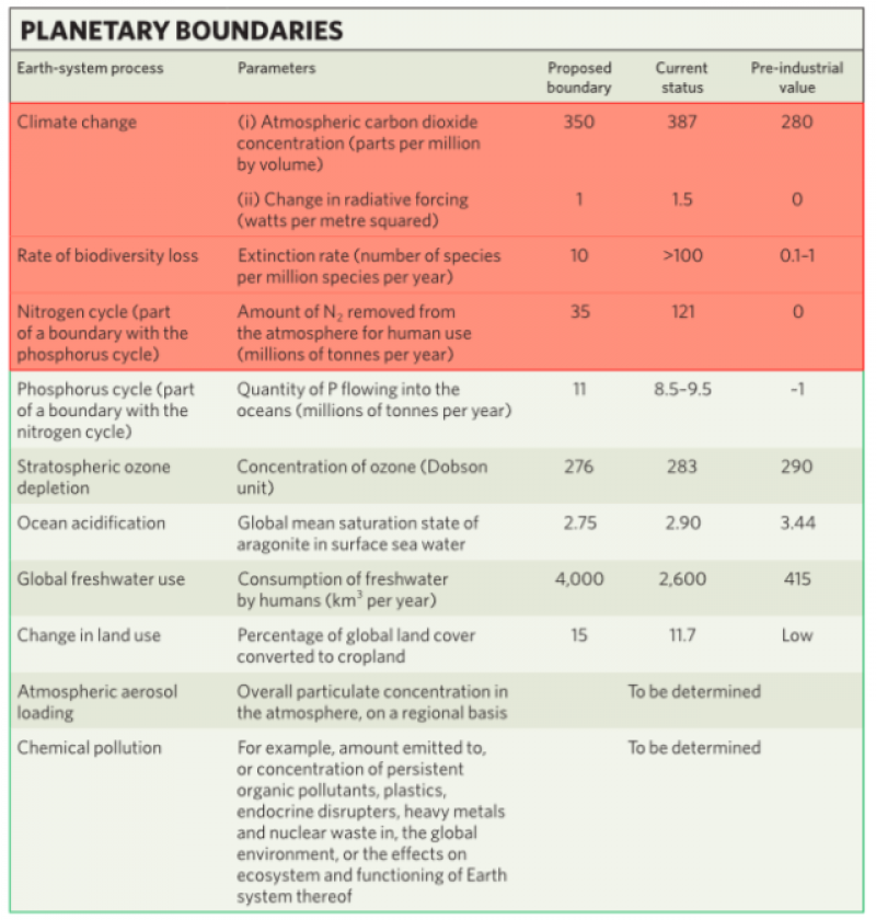 In 2009 hebben klimaatwetenschappers een kader bedacht waarin de vitale functies van de Aarde staan opgelijst. Zo werden er negen "planetaire grenzen" waarbinnen de menselijke beschaving kan blijven groeien, gecreëerd. De wetenschappers besloten om een oogje in het zeil te houden op deze grenzen zodat ze kunnen voorspellen wanneer de tijd voor de mens er hier op zit.