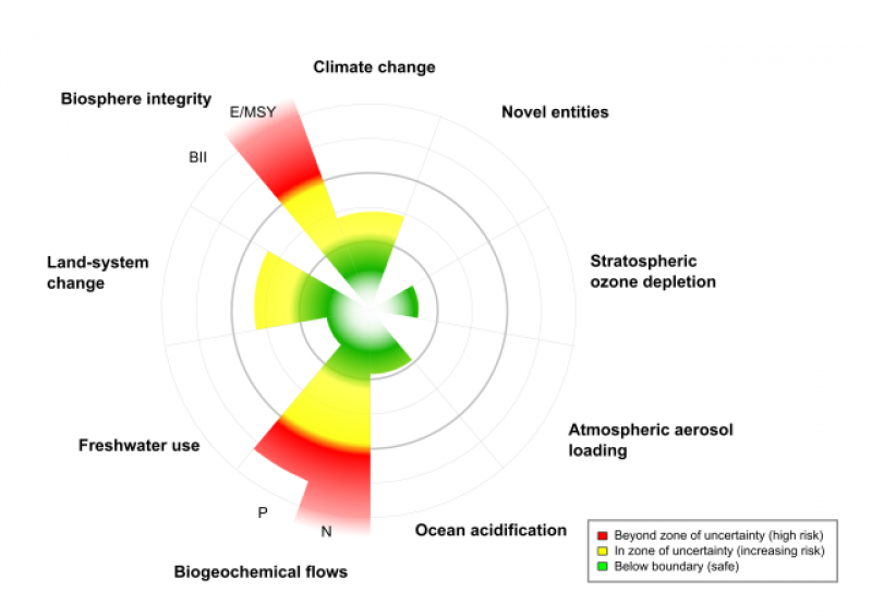 Onderstaande grafiek beschrijft de negen planetaire grenzen zoals ze werden beschreven in 2009.