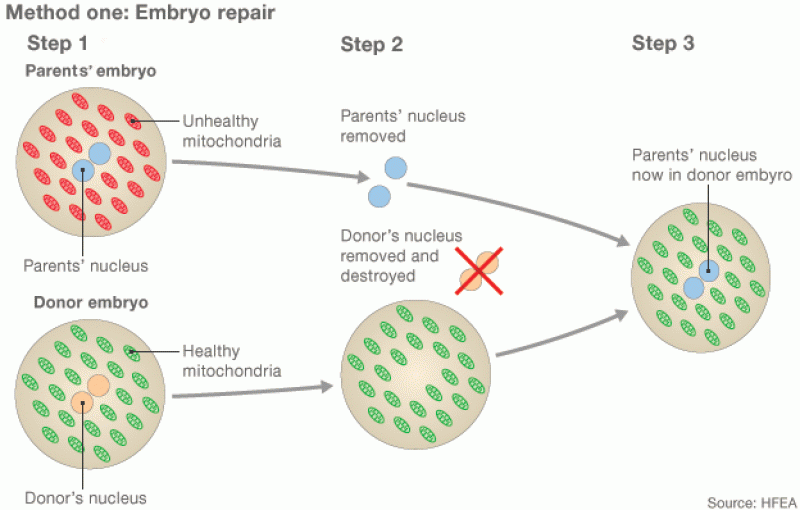 Het wetenschappelijk panel, dat werd samengesteld door de Human Fertilisation and Embryology Authority (HFEA), beoordeelde twee technieken van in-vitrofertilisatie waarbij genetisch materiaal van drie personen wordt gebruikt. Het komt erop neer dat het sperma van de vader wordt gebruikt om twee eicellen te bevruchten: één eicel van de moeder en één eicel van een donor, waardoor twee embryo's ontstaan. Bij beide embryo's worden de celkernen verwijderd. De celkernen van de moeder worden dan in het embryo van de donor geplaatst, waardoor de afgeweken mitochondriën niet worden doorgegeven. Nadien wordt het embryo van de donor met de celkernen van de moeder ingeplant in de baarmoeder van de moeder. De celkernen bevatten het meeste genetische materiaal, maar de mitochondriën van de donor bevatten ook een beetje genetisch materiaal.