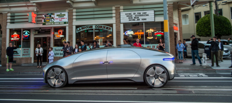 We zijn in San Francisco, Californië. En we hebben geluk, want er staat een stralende zon aan de hemel en de zilveren lak weerkaatst duizend-en-een zonnestralen. Zijn vormen zijn verrassend, met een wijd open rooster, een lage wegligging, enorme wielen en nagenoeg geen scherpe hoeken. De verantwoordelijke van de testrit haalt zijn smartphone boven en belt' het prototype met een simpel vingergebaar. Want een autonome wagen, die parkeert zichzelf en komt je helemaal alleen halen!