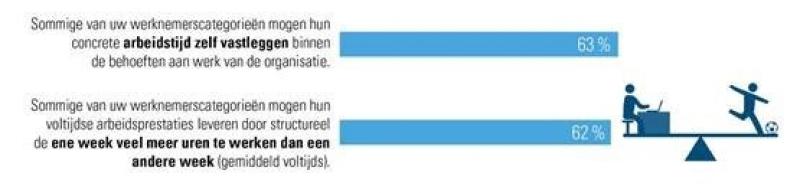 Werkgevers houden niet meer per se vast aan vaste arbeidstijden. 63% van de respondenten uit de werkgeversbevraging stelt dat ze toestaat dat bepaalde werknemerscategorieën het precieze tijdstip van hun arbeidstijd zelf vastleggen binnen de werkbehoeften. Als dat betekent dat het personeel de ene week meer werkt dan de andere week, dan kan dat voor 62% van de werkgevers. De meerderheid van de werkgevers is met andere woorden eerder gefocust op wat moet gebeuren dan op wanneer het gebeurt. Op voorwaarde dat het op tijd gebeurt.