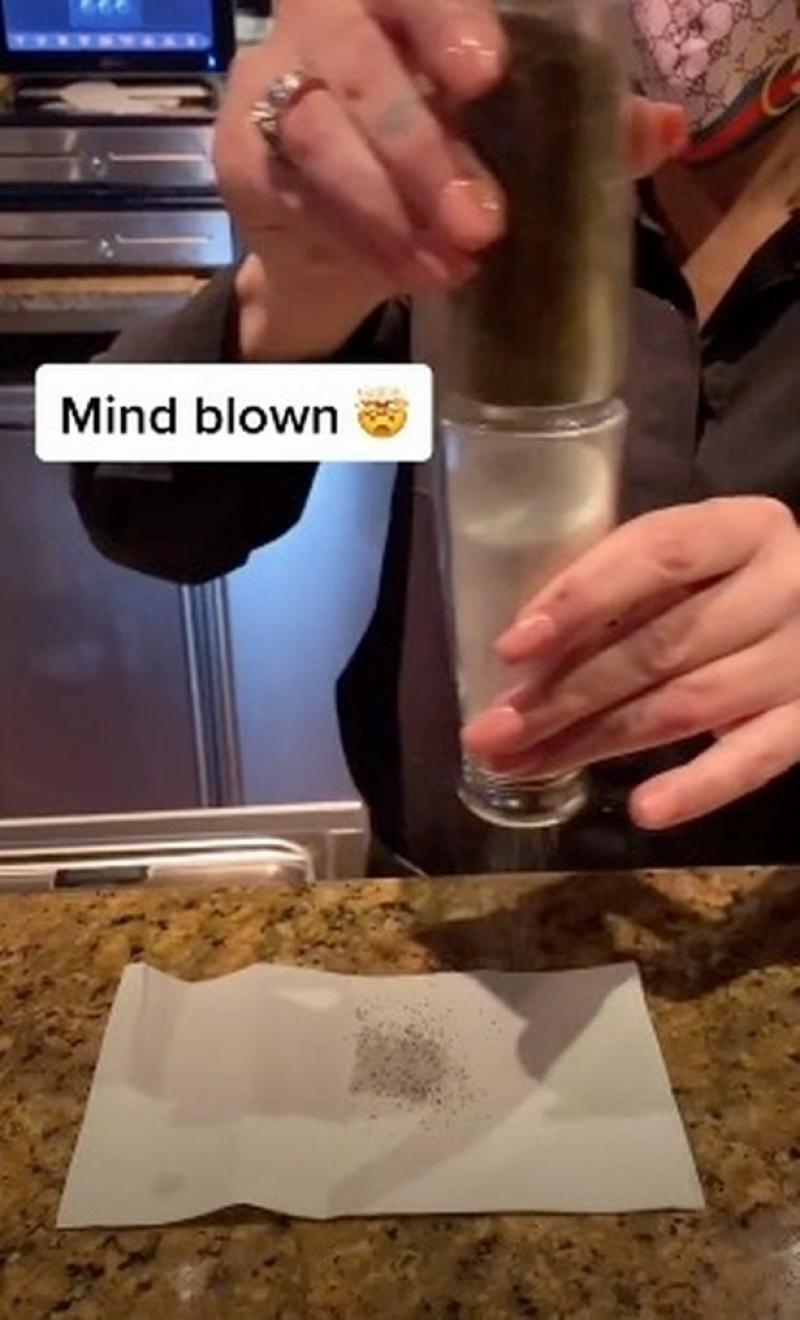 In de video houdt de vrouw het pepervat ondersteboven. Ze laat vervolgens de ribbels op de bodem van het zoutvaatje rond de ribbels van de peper lopen, zoals te zien is in de clip hierboven.