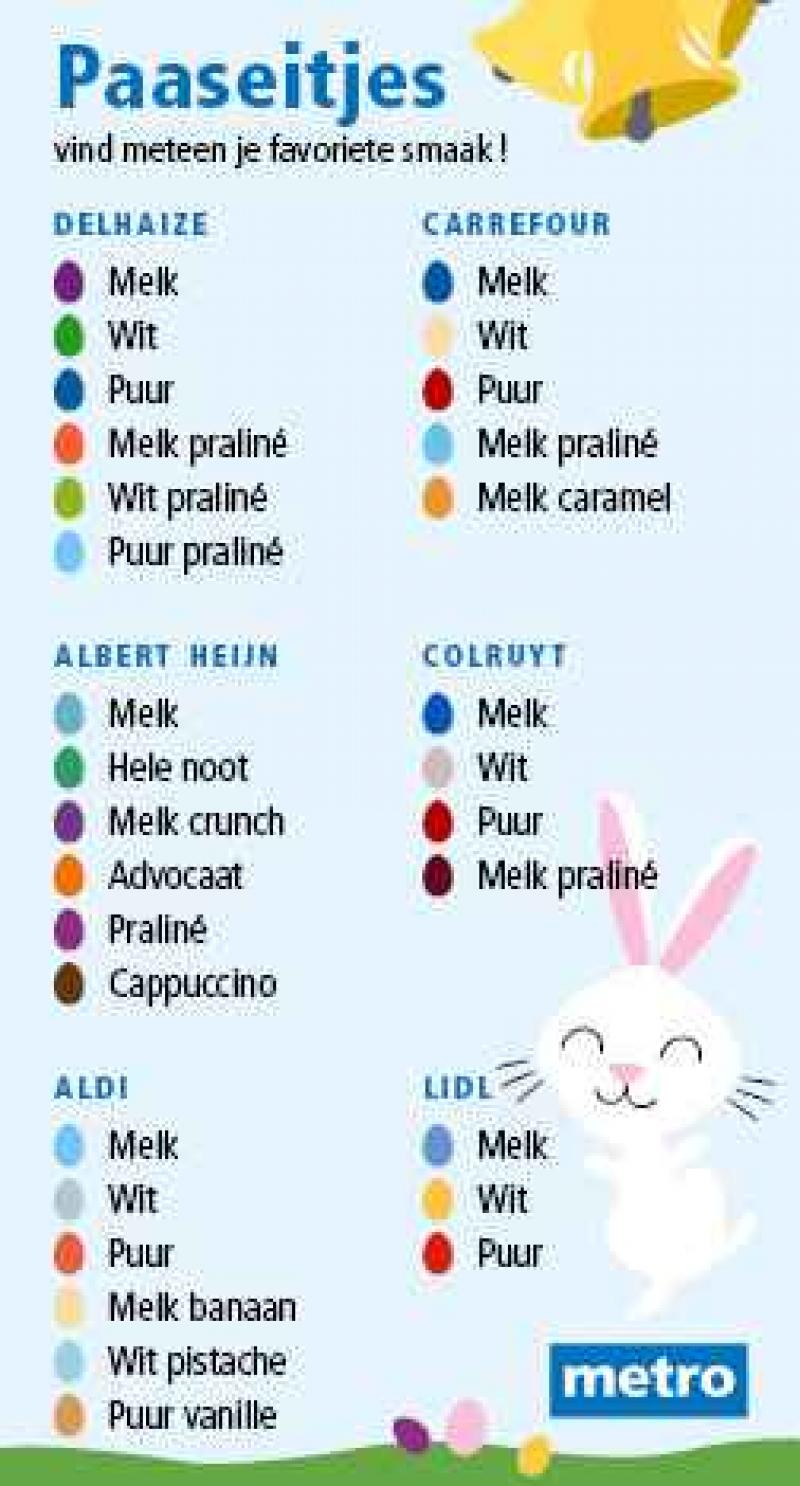 Dit weekend is het opnieuw Pasen, en dat betekent dat de supermarkten weer bomvol liggen met chocolade eitjes. Ben je fan van melk praliné of een crunchy variant, maar vind je advocaat of pistache maar niets? Gebruik dan deze legende. Zo kom je nooit meer voor een onaangename verrassing te staan én kan je tijdens Pasen je buik rond eten. Smakelijk!