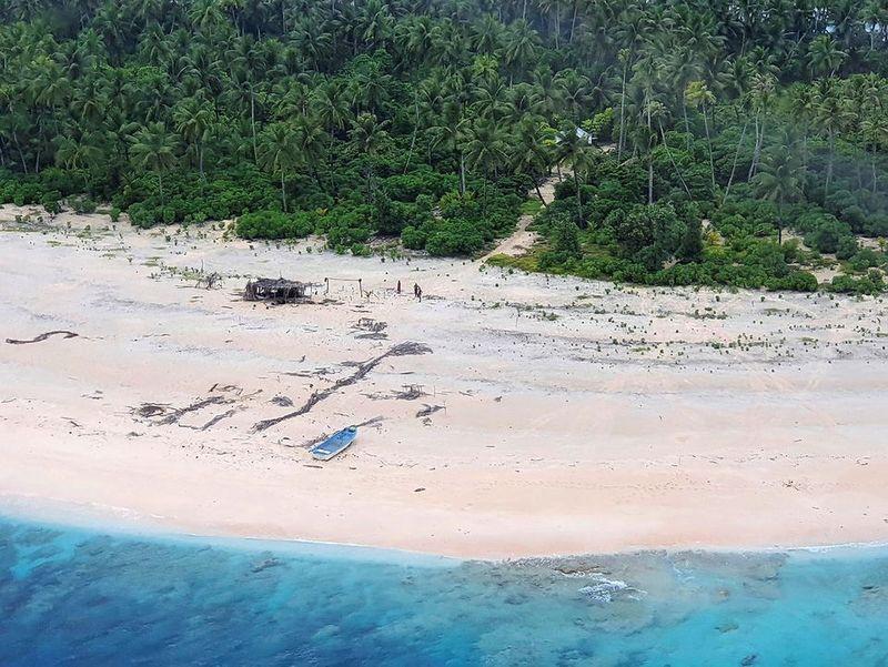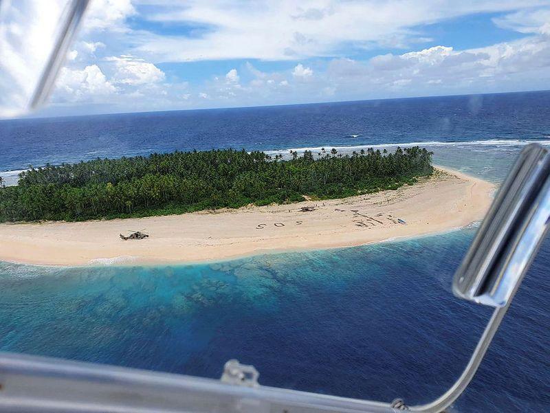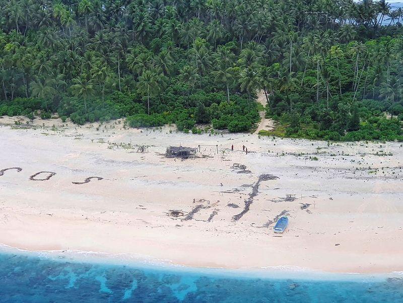 De noodkreet die ze op het strand van het eiland Pikelot schreven, werd gezien door een Australisch en Amerikaans vliegtuig, staat in de mededeling. Het eiland ligt op 190 kilometer van de plaats waar ze vertrokken.