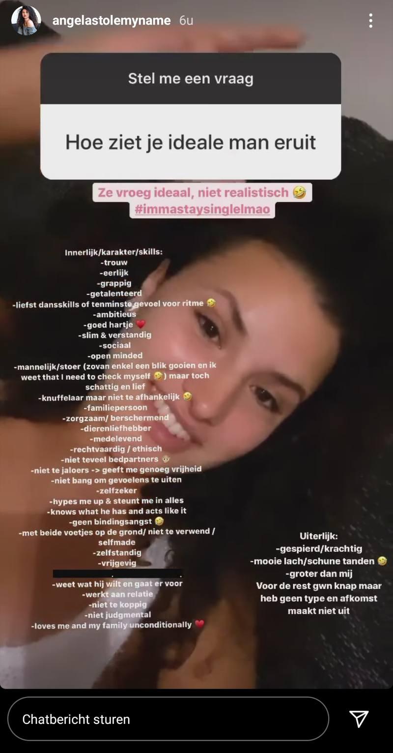 De 26-jarige brunette uit Antwerpen kreeg op Instagram de vraag wat haar ideale man zou zijn qua innerlijk en uiterlijk. Wel, dat is een behoorlijk lang lijstje. Als het over zijn karakter gaat, dan zoekt de doctoraatsstudente iemand die onder meer trouw, eerlijk, grappig, getalenteerd (danser), ambitieus, verstandig, sociaal, stoer, zorgzaam, zelfstandig, vrijgevig, rechtvaardig en niet te koppig of jaloers is. Bovendien mag hij niet te veel bedpartners hebben, niet verwend zijn en geen bindingsangst hebben.