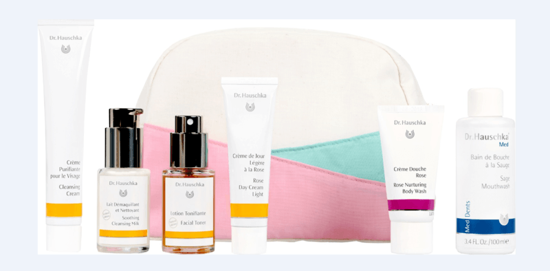 Het merk Dr. Hauschka bundelt zijn beauty essentials in een milieuvriendelijk toilettasje van organisch katoen. Er is er eentje voor elk huidtype. Het etuitje bevat een zuiverende crème, reinigingsmelk, gezichtslotion, dagcrème, douchecrème en mondwater met salie.