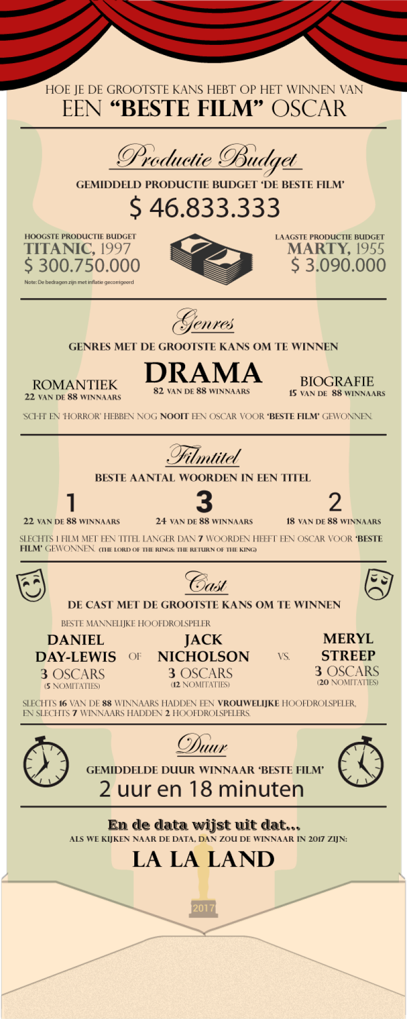 Aankomende zondag vindt de 89e uitreiking van de Oscars plaats. Films met vele nominaties zijn onder andere 'La La Land' en 'Moonlight'. Maar als je naar de statistieken kijkt, met welke film maak je dan het meeste kans op de prijs voor 'Beste Film'? Besparingsplatform Flipit.com Belgie analyseerde de gegevens van alle Beste Film'-winnaars en onderzocht met hoeveel budget je het meeste kans maakt om deze Oscar te winnen.