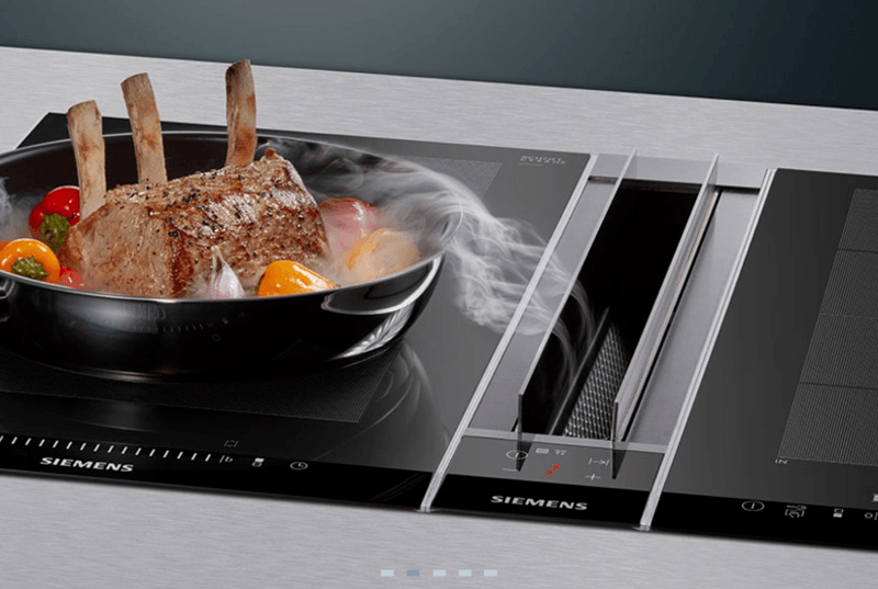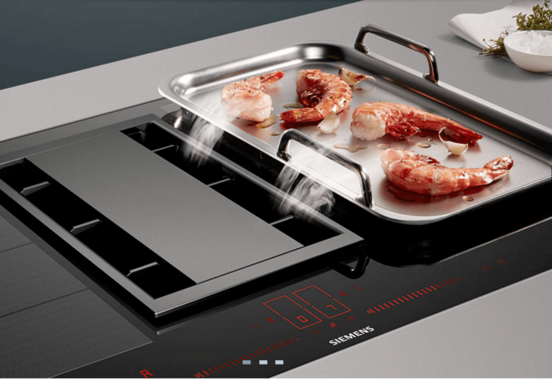Wist je dat je ook afzuigsystemen bij de bron hebt? Het inductionAir System is een 80 centimeter brede flexInduction kookplaat met een eigen ventilatiesysteem. Het ventilatiesysteem heeft een afvoer naar buiten of werkt in kringloop. Het systeem bevindt zich tussen de twee kookzones. Zo worden de etensgeuren meteen naar beneden gezogen en krijgen ze geen kans om te ontsnappen in de open ruimte. Het inductionAir System moet helemaal niet onderdoen voor een gewone dampkap, integendeel zelfs! Ook als je aan het frituren bent, verslaat het ventilatiesysteem de hardnekkigste dampen.