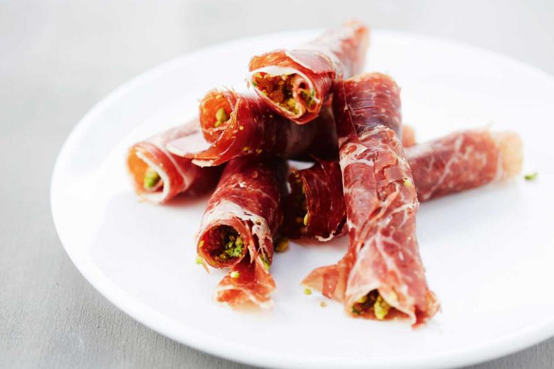 Beleg elk plakje van de Iberische Bellota-ham met een theelepel van het mengsel. Rol op en de schik de rolletjes op een bord om te serveren. Laat het smaken!