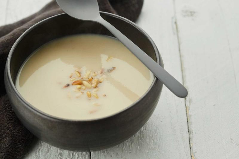 Serveer het knolseldersoepje met geroosterde pijnboompitten.