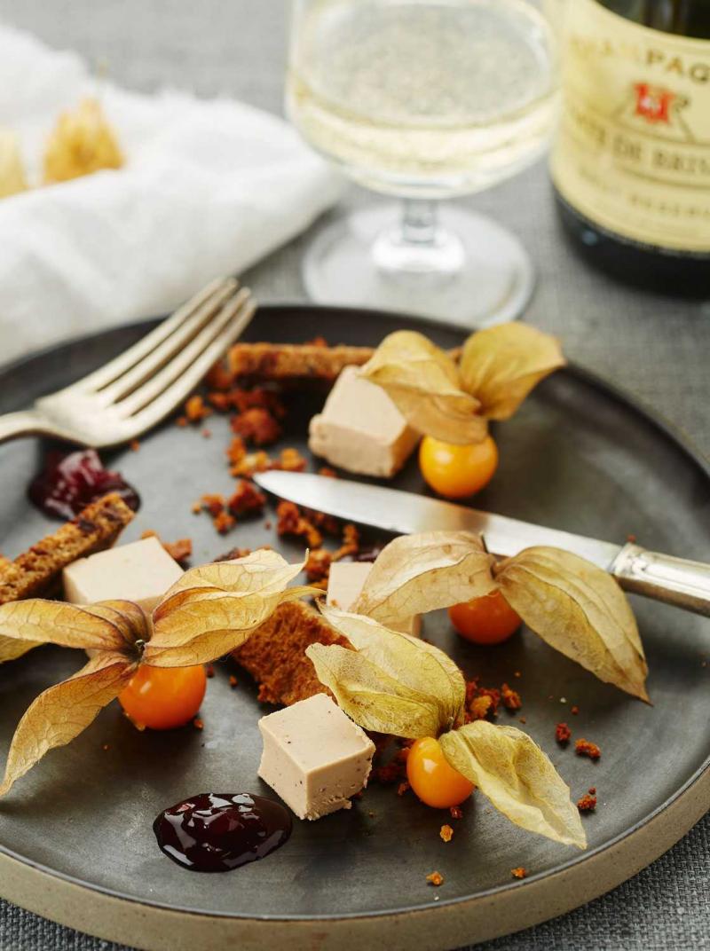 Snij de faux gras in blokjes. Schik het brood en de faux gras op borden, samen met de physalis. Werk af met het veenbessen- en uienkonfijt en de krokante peperkoekkruimels. Smakelijk & fijne feestdagen!