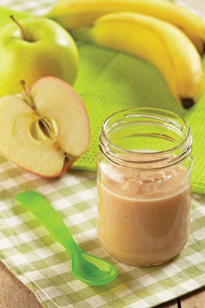 Schil een halve appel, pel een banaan en pers het sap uit een halve sinaasappel. Rasp vervolgens de halve appel, plet de banaan en meng het fruit tot een papje. Voeg ten slotte het sinaasappelsap toe, maar let op dat het geheel niet te vloeibaar wordt.