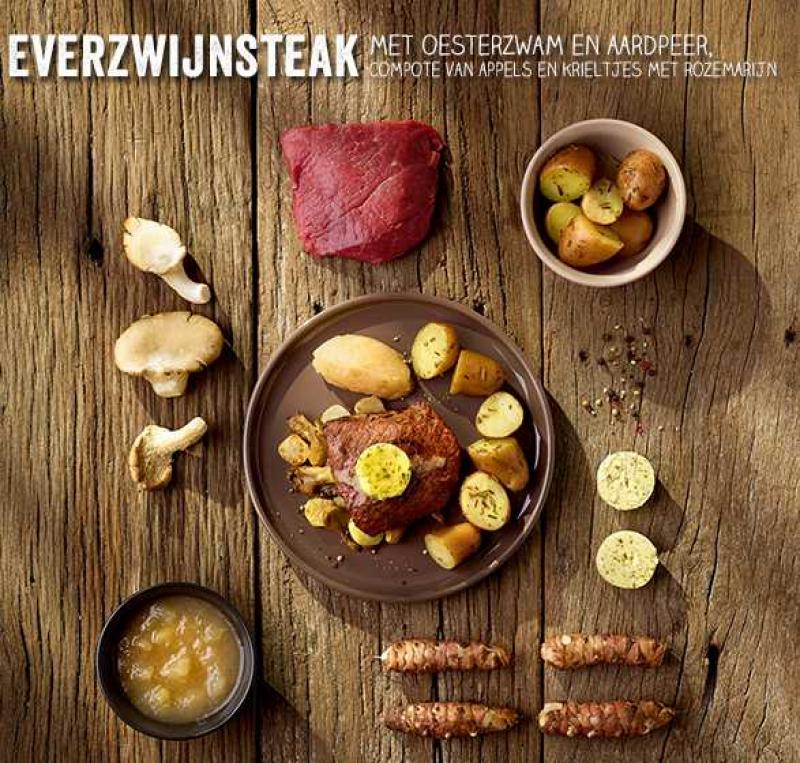 Serveer de everzwijnsteaks met een stukje lookboter erbovenop, zodat de boter over het vlees smelt. De appelcompote kan eventjes opwarmen of evengoed koud opdienen. Smakelijk!