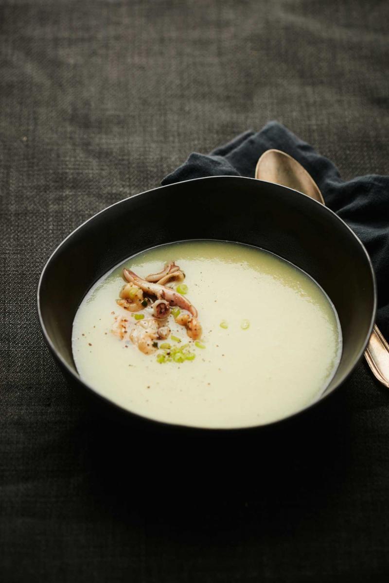 Werk de pastinaaksoep af door zeevruchten, enkele fijne stukjes lente-ui en een paar druppels hazelnotenolie toe te voegen in elk bord. Smakelijk eten!