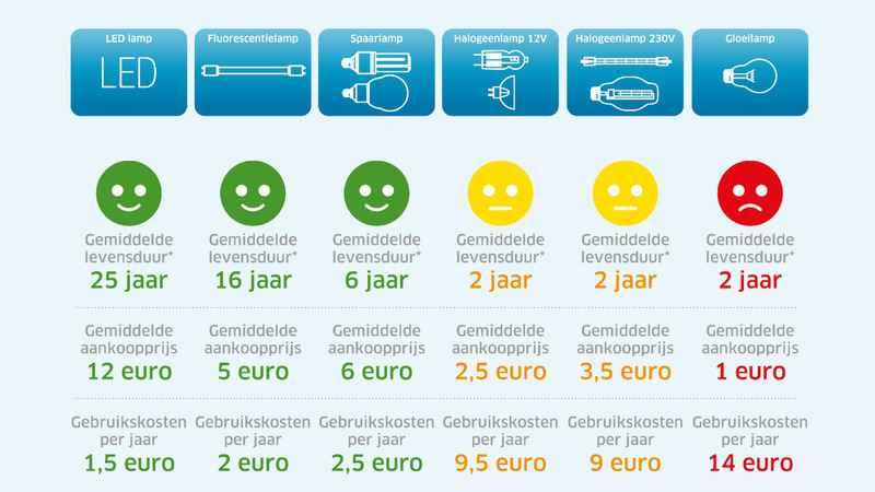 De tabel hieronder vertelt je alles over de specifieke eigenschappen van elke soort lamp. Je ziet: de gemiddelde aankoopprijs, levensduur en gebruikskosten lopen sterk uiteen.