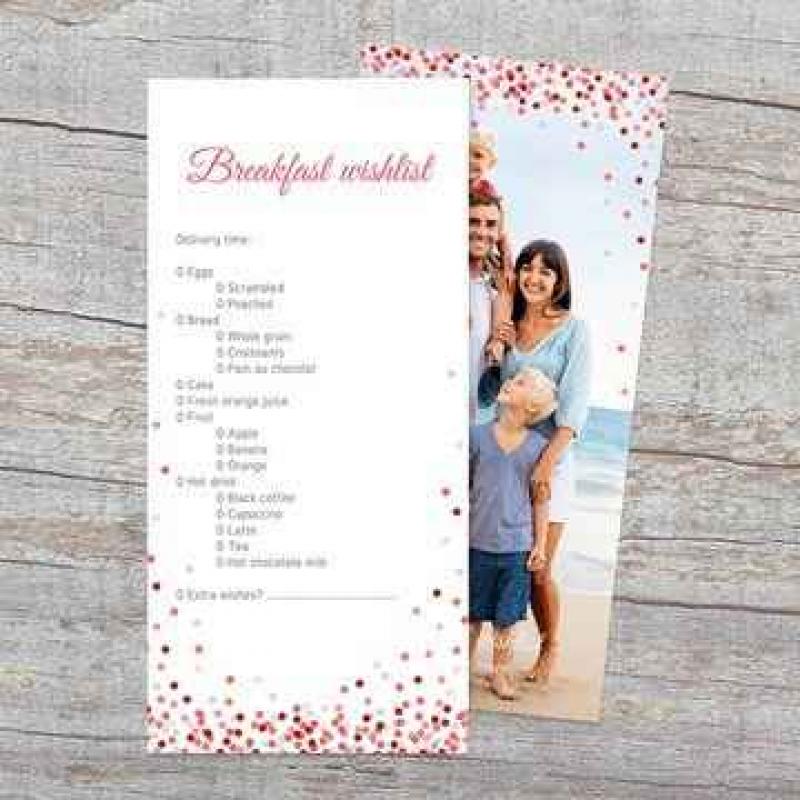 Hoeft het ontbijt geen verrassing te zijn en pak je het graag professioneel aan? Maak dan vooraf een fotokaart op die mama mag invullen. Vraag haar wanneer ze wil ontbijten, hoe ze haar eitje lust, welke broodjes en (warme) drank ze verkiest en of ze er graag wat fruit bij krijgt.