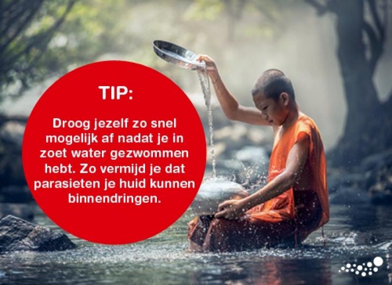 Na een dag wandelen om alle mooie plekjes van je land van bestemming te ontdekken, ziet het water van een meer eruit als een welkome verfrissing. Pas echter op voor zoet water, dat vooral in ontwikkelingslanden door schadelijke parasieten besmet kan zijn. Kies er liever voor te zwemmen in het zilte zeewater of in een gedesinfecteerd zwembad.