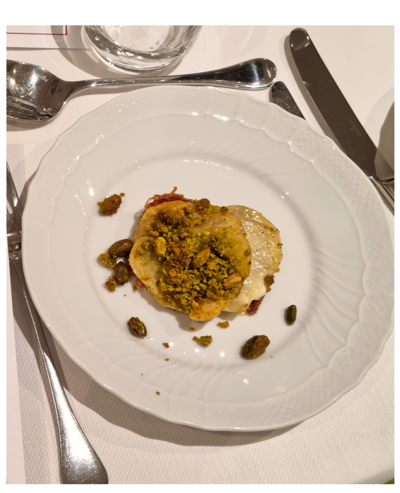 Voorgerecht: Millefeuille van Zampone Modena IGP, aardappelen, Stracchino en gezouten pistachenoten