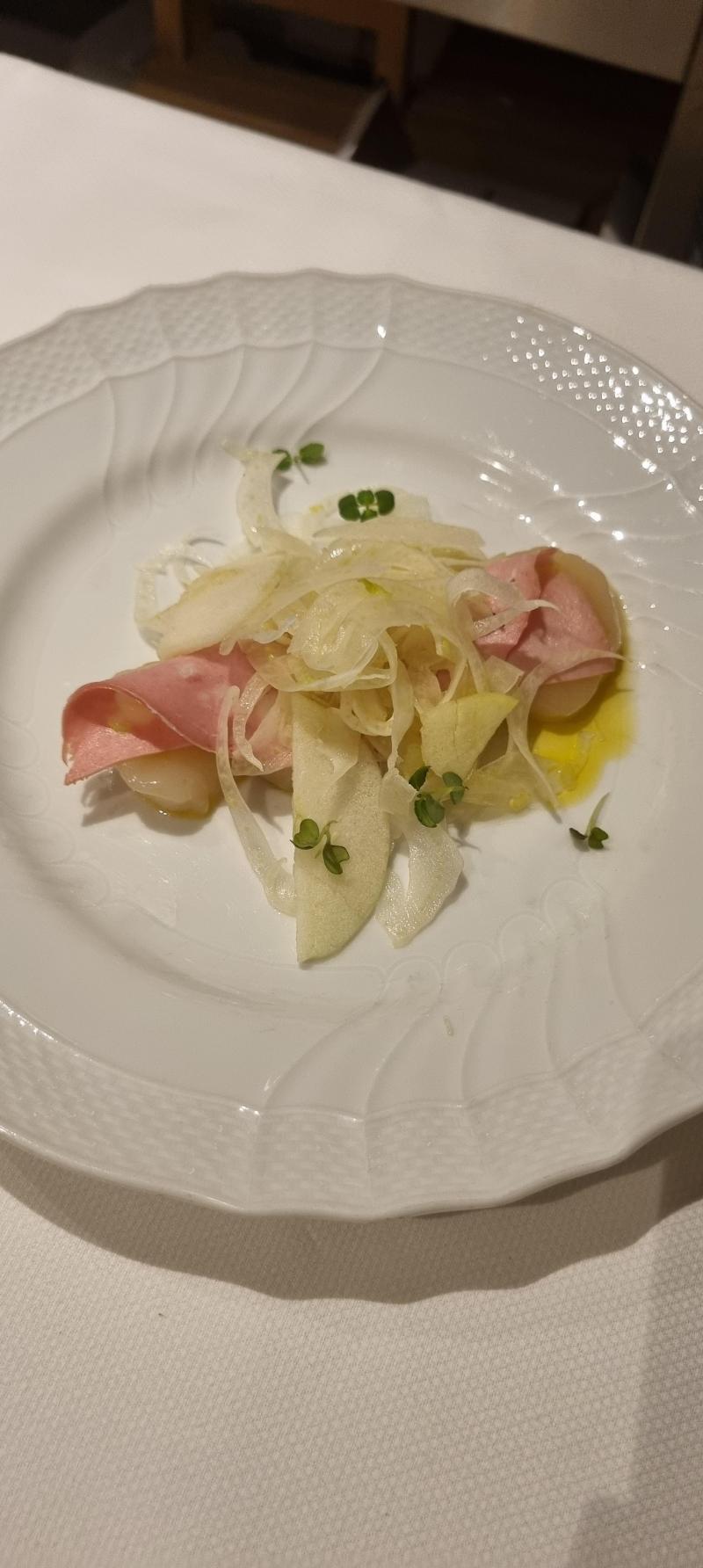Tweede voorgerecht: Gemarineerde sint-jakobsschelpen, Mortadella Bologna IGP en venkel- en appelsalade