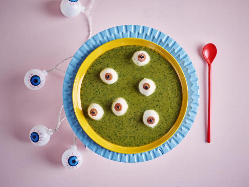 Voor de Halloween touch: schep een lepel uit in een diep bord aan tafel, zodat je het bord niet meer moet verzetten, leg er een paar mozzarella balletjes in.