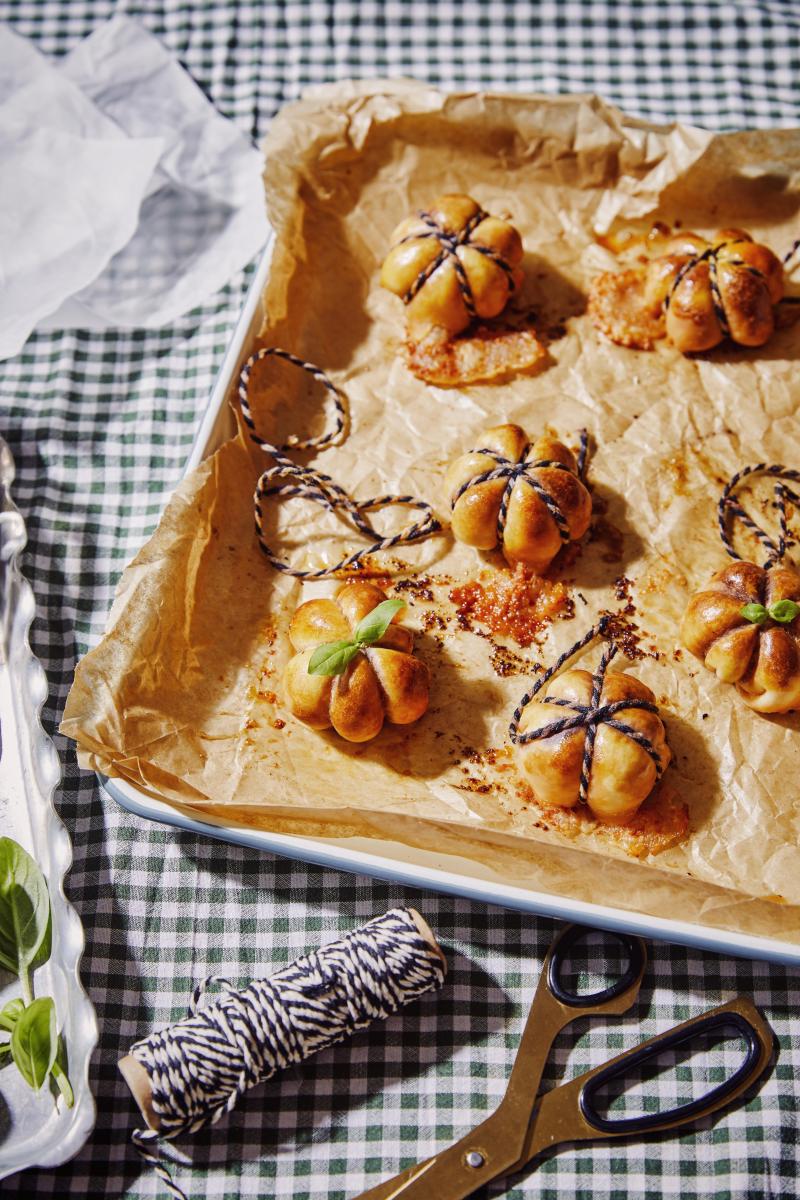 «Deze gevulde pompoentjes maak je gemakkelijk zelf met pizzadeeg, tomatensaus, mozzarella en een beetje keukentouw, natuurlijk zullen de kids graag meehelpen! Dit zijn eigenlijk cute mini pizzaatjes, opgebonden met smeltende kaas en pesto aan de binnenkant, njaaaaaam!», aldus Sofie.