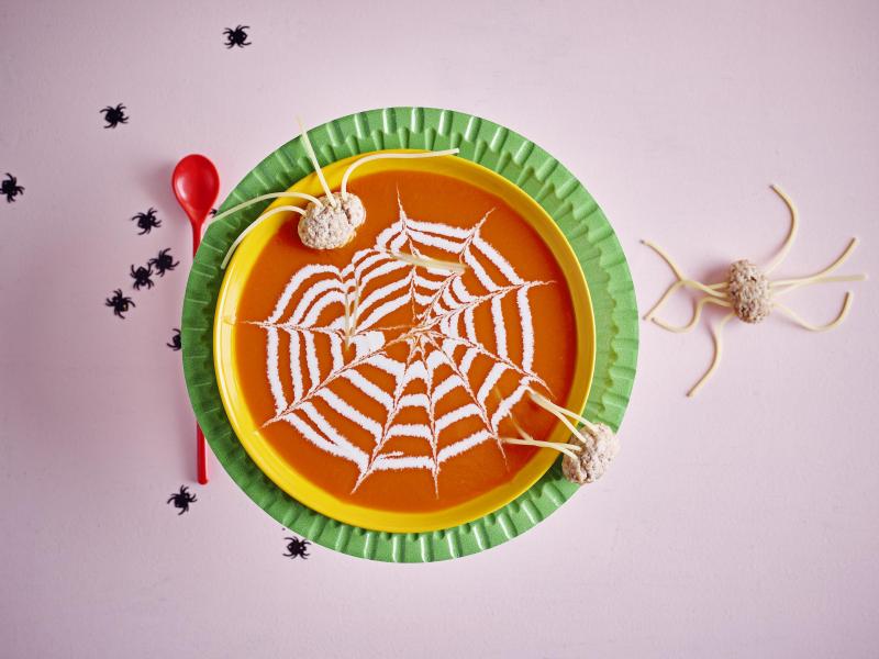 «Dit is een klassieke tomatensoep met balletjes, die we voor Halloween kunnen pimpen tot spinnenweb en griezelige spinnen. Het is suuupertof om dit met de kinderen klaar te maken. Ze eten dubbel zoveel verse soep en groenten!»