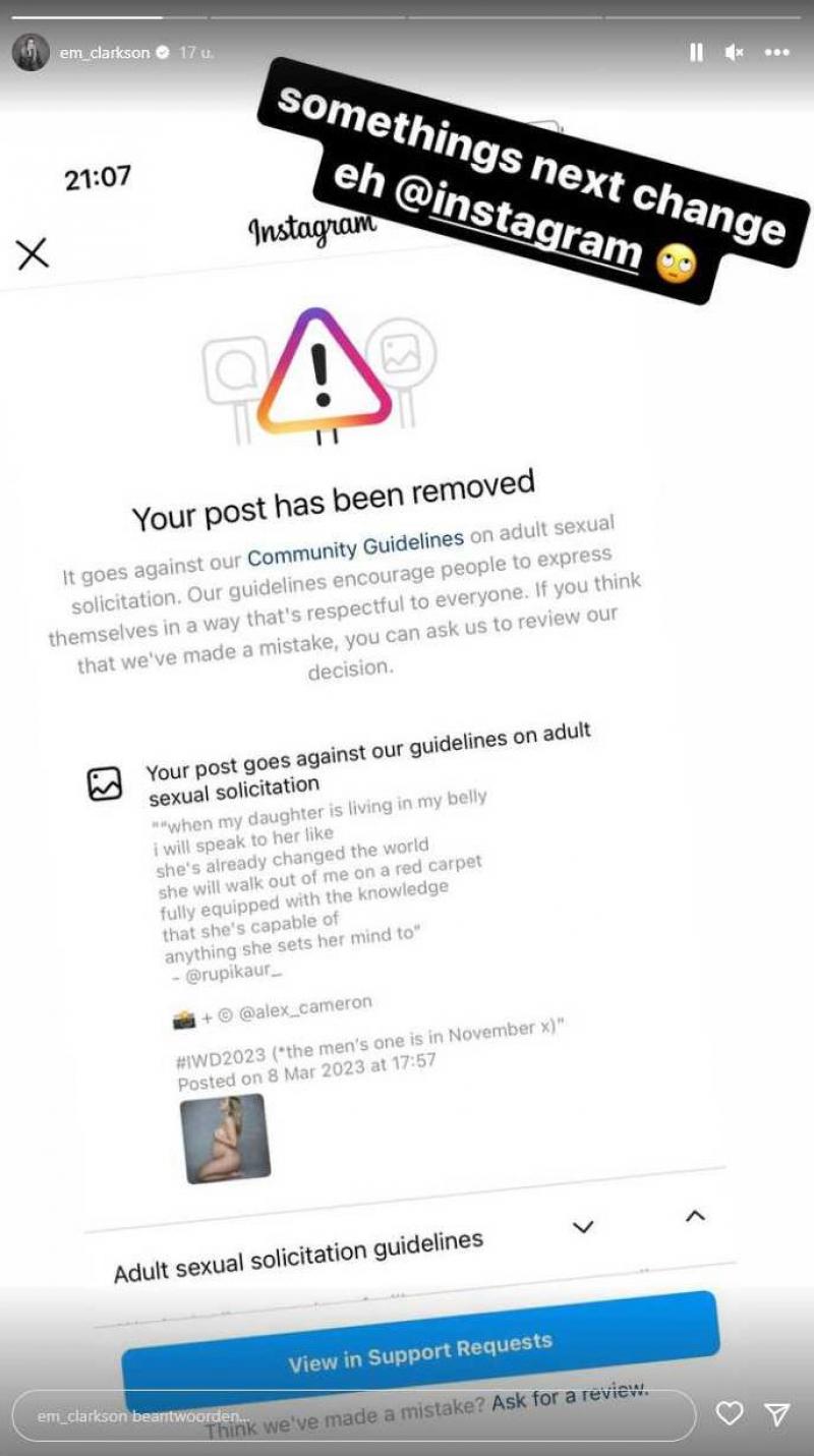 «Hoe lang voor de foto verwijderd wordt door Instagram?», vroeg iemand zich af. En inderdaad, enkele uren nadat ze de kiekjes postte, haalde het socialemediaplatform ze weg wegens schending van het beleid op het gebied van naaktheid. Emily ging daar echter tegenin en kreeg even later gelijk.