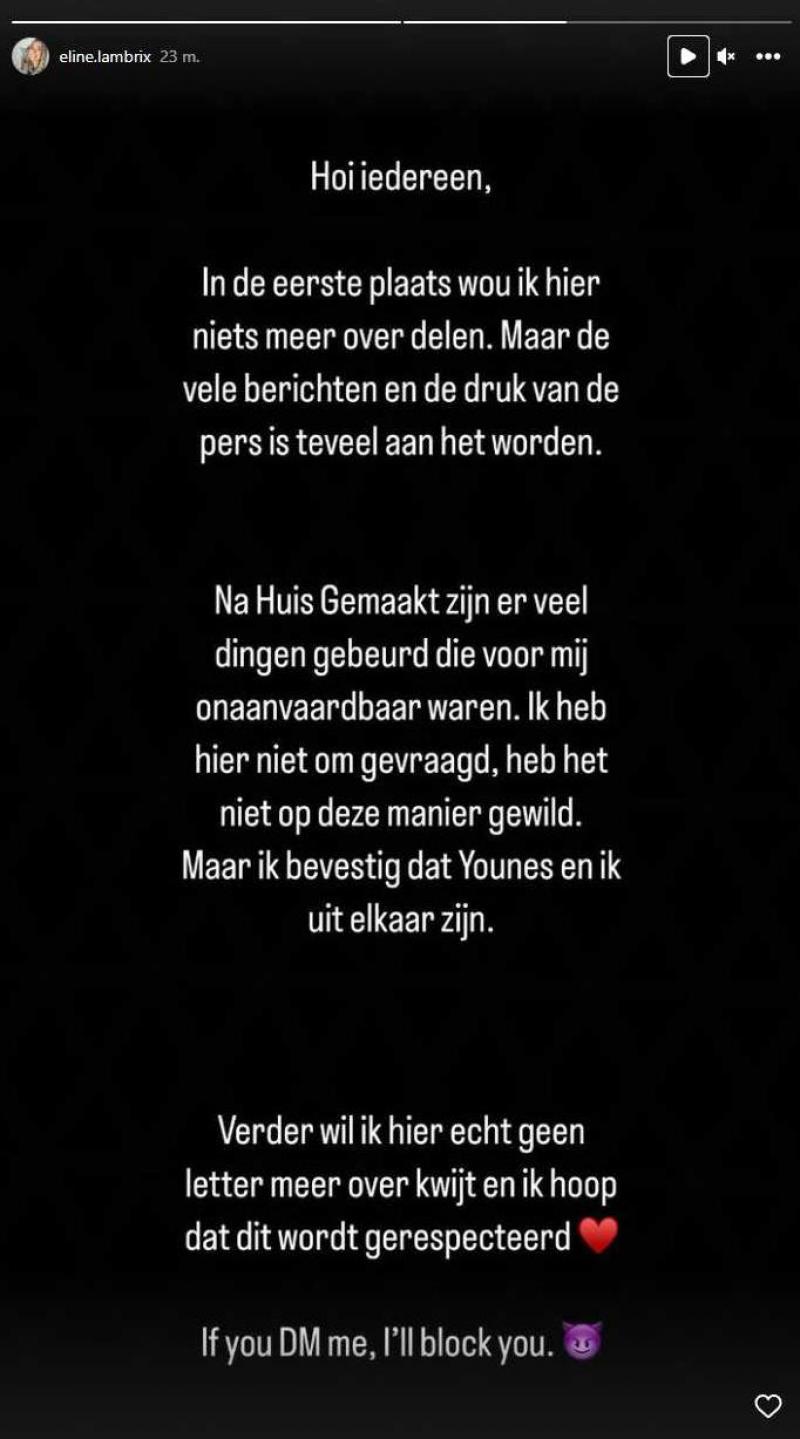 Iemand moest vorig jaar het programma ‘Huis gemaakt’ winnen en hoe dicht ze er ook bij waren, toch trokken Younes en Eline aan het kortste eind. Nu blijkt dat het Limburgse koppel uit elkaar is. «Na ‘Huis gemaakt' zijn er veel dingen gebeurd die voor mij onaanvaardbaar waren. Ik heb hier niet om gevraagd, ik heb het niet op deze manier gewild. Maar ik bevestig dat Younes en ik uit elkaar zijn», schrijft Eline op Instagram.