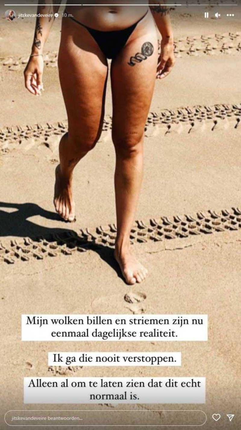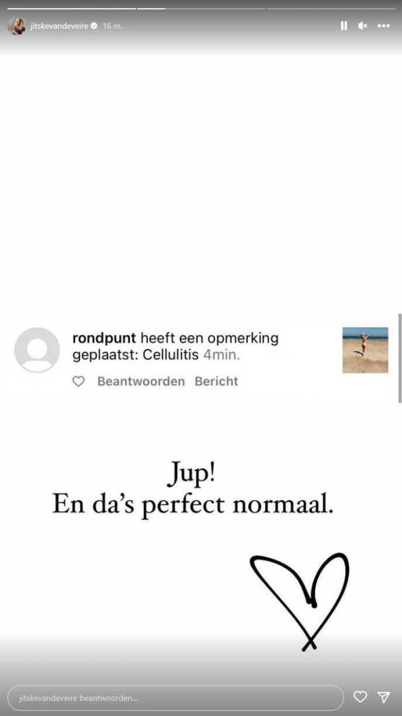 Afgelopen weekend zocht Jitske Van de Veire de verfrissing op in Knokke-Heist. De 29-jarige eigenares van kapperszaak ‘Jitske Knipt’ deelde enkele kiekjes ervan waarop ze in bikini te zien is. Zowat iedereen reageerde erg positief op de foto’s, maar een enkeling antwoordde: «Cellulitis».