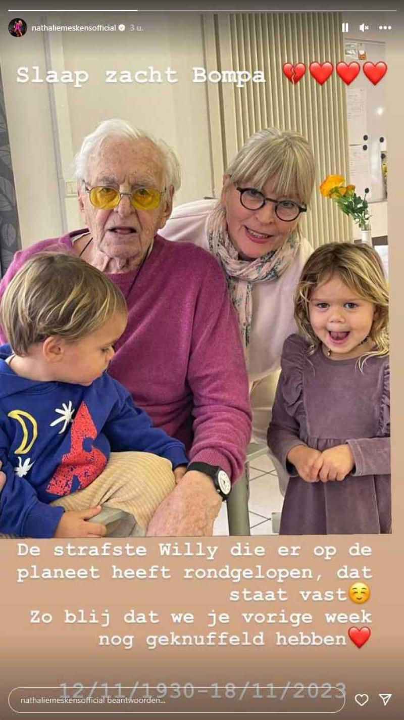 Treurig nieuws in de familie van Nathalie Meskens. Haar bompa Willy is afgelopen weekend op 93-jarige leeftijd overleden. De 41-jarige ‘Gina & Chantal’-actrice deelde op Instagram een foto van hem met een mooi bijschrift. «Slaap zacht, bompa», klinkt het.