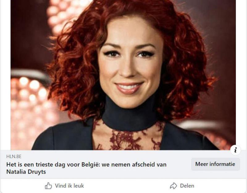 «Het is een trieste dag voor België: we nemen afscheid van Natalia Druyts», kopt de site News Beats. Eronder staat ‘HLN.be’ waardoor het lijkt dat je naar die site doorverwezen zou worden. Niets is minder waar. In plaats daarvan komen gebruikers terecht op websites die trachten om geld af te troggelen.