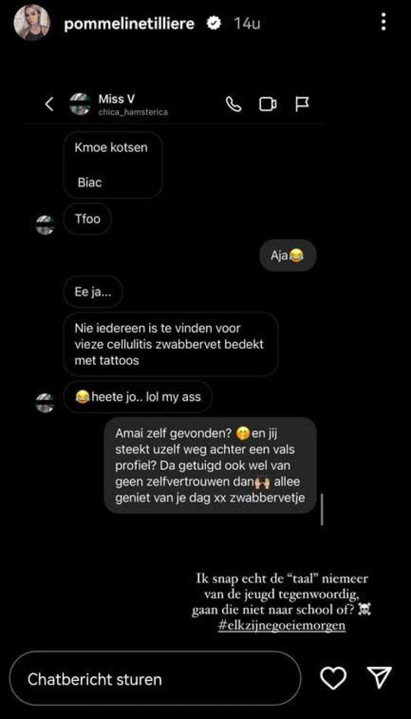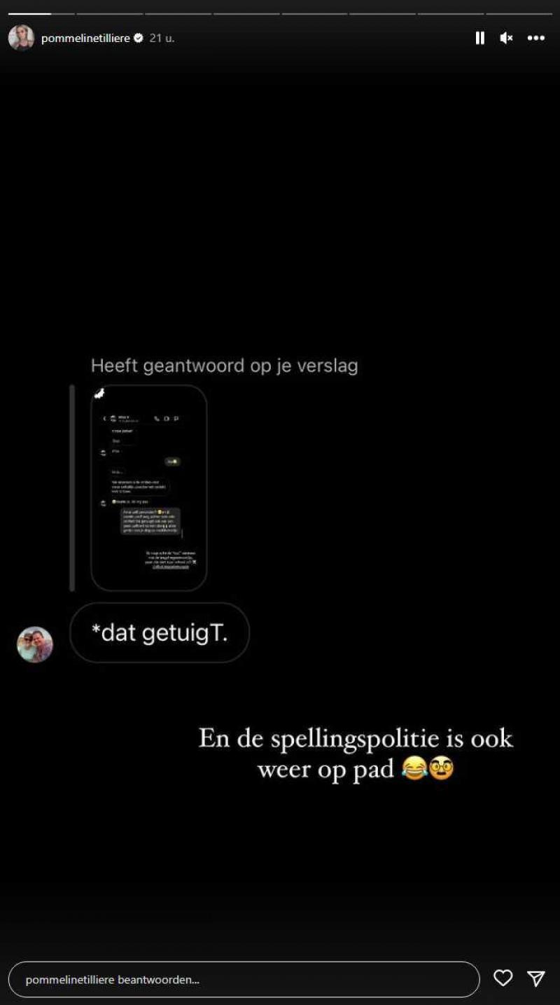 Vervolgens wees een andere volger haar op haar schrijffout: «Dat getuigT». Ook over die opmerking wou Pommeline nog iets kwijt. «Ik snap ook gewoon niet dat mensen zich constant zo moeien. Ik snap het gebruik van de dt-regel sowieso niet. Als ik een ‘d’ of een ‘t’ wil zetten, dat maakt mij echt niet uit. Het gaat om het taalgebruik van die jongeren, het straattaalgebruik, het vernoemen van ‘zwabbervet’ enzovoort. Dat bedoel ik. Ik krijg het echt van mensen. Ofwel zijn jullie bodyshamers en sturen jullie mij dat ik dik of lelijk ben, ofwel zijn jullie taalverbeteraars. Laat me gewoon met rust!», weert ze zich op haar Instagram Stories.