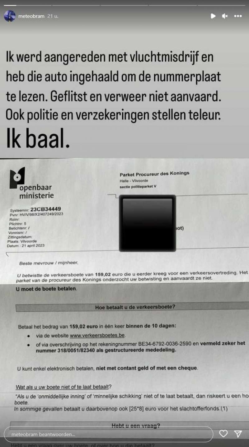 Tot overmaat van ramp werd hij tijdens die snelle achtervolging geflitst, wat hem een boete opleverde van 159 euro. Hij probeerde de boete aan te vechten, maar tevergeefs. «Ik werd aangereden met vluchtmisdrijf en heb die auto ingehaald om de nummerplaat te lezen. Geflitst en verweer niet aanvaard. Ook politie en verzekeringen stellen teleur. Ik baal», zucht hij op Instagram.