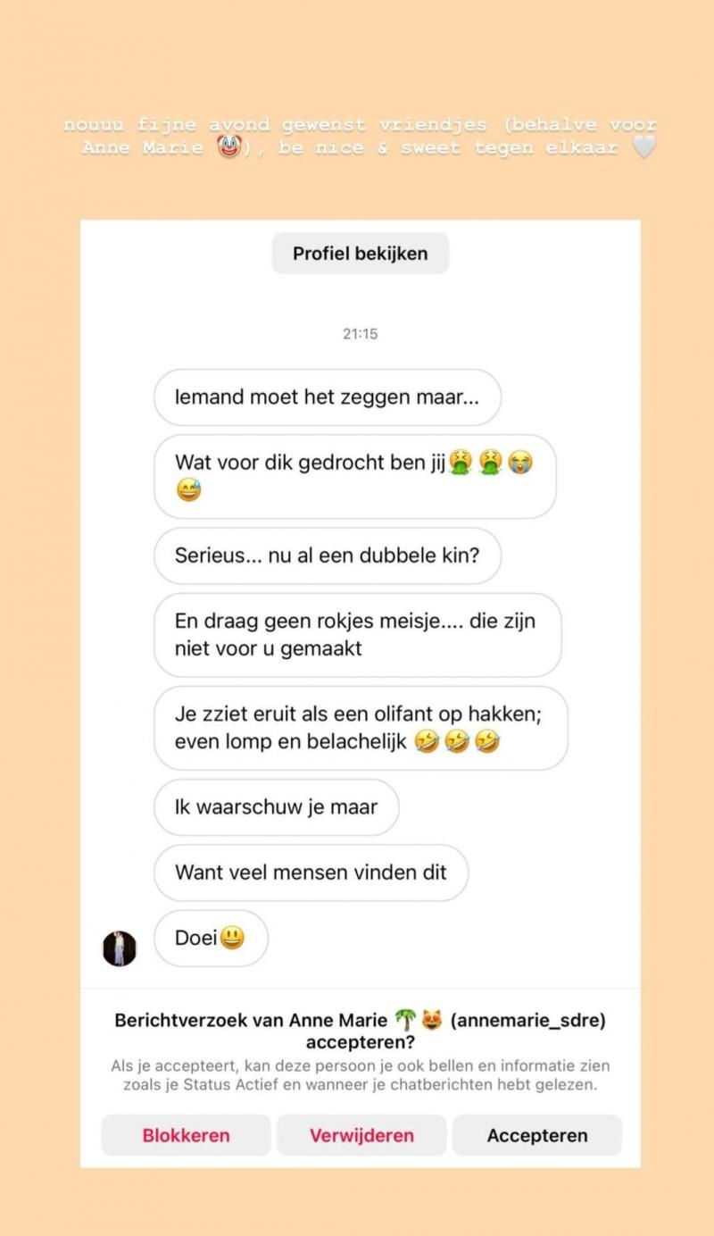 «Ik schrok me dood toen ik het las. Ik krijg zelden haatberichten en moest twee keer slikken toen ik het bericht binnenkreeg», vertelt ze. Ze had de berichten gedeeld op Instagram. Daarin valt te lezen hoe een vrouw Zita een «dik gedrocht» noemt, en een «olifant op hakken», met een «dubbele kin». «Ik vraag me af wat ik die vrouw misdaan heb», zegt ze daarover. «Ik ken haar niet, maar ik denk dat ze zich ongelukkig voelt, want anders stuur je zulke berichten niet.»